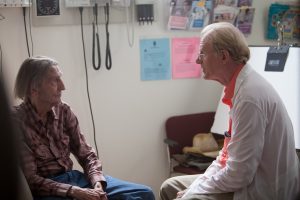 Amazed at his 90-year-old patient’s remarkable health, Dr. Christian Needler (Ed Begley Jr., right) discusses the regimens employed by Lucky (Harry Dean Stanton, left), a spry but reclusive retired military vet, in director John Carroll Lynch’s debut feature, “Lucky.” Photo courtesy of Magnolia Pictures.