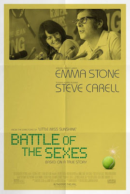 “Battle of the Sexes” (2017). Cast: Emma Stone, Steve Carell, Andrea Riseborough, Natalie Morales, Sarah Silverman, Bill Pullman, Alan Cumming, Elisabeth Shue, Eric Christian Olsen, Fred Armisen, Jessica McNamee, Austin Stowell, Wallace Langham, Lewis Pullman, James Mackay, Cooper Friedman. Archive Footage: Howard Cosell, Howard K. Smith, Roosevelt Grier, Chris Evert, Lloyd Bridges, George Foreman. Directors: Jonathan Dayton and Valerie Faris. Screenplay: Simon Beaufoy. Web site. Trailer.