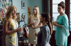 Healer and massage therapist Beatriz (Salma Hayek, second from right) feels somewhat out of place at an upscale dinner party hosted by one of her clients, Kathy (Connie Britton, left), along with her well-to-do guests Shannon (Chloë Sevigny, second from left) and Jeana (Amy Landecker, right), in the new dark satire, “Beatriz at Dinner.” Photo by Lacey Terrell, courtesy of Roadside Attractions.