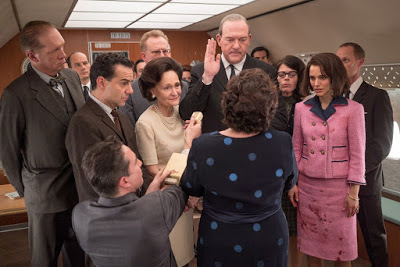 Incoming President Lyndon Johnson (John Carroll Lynch, center) is sworn into office as successor to assassinated President John F. Kennedy as incoming First Lady Lady Bird Johnson (Beth Grant, left) and widowed First Lady Jackie Kennedy (Natalie Portman, right) look on in “Jackie.” Photo by Bruno Calvo, courtesy of Fox Searchlight Pictures.