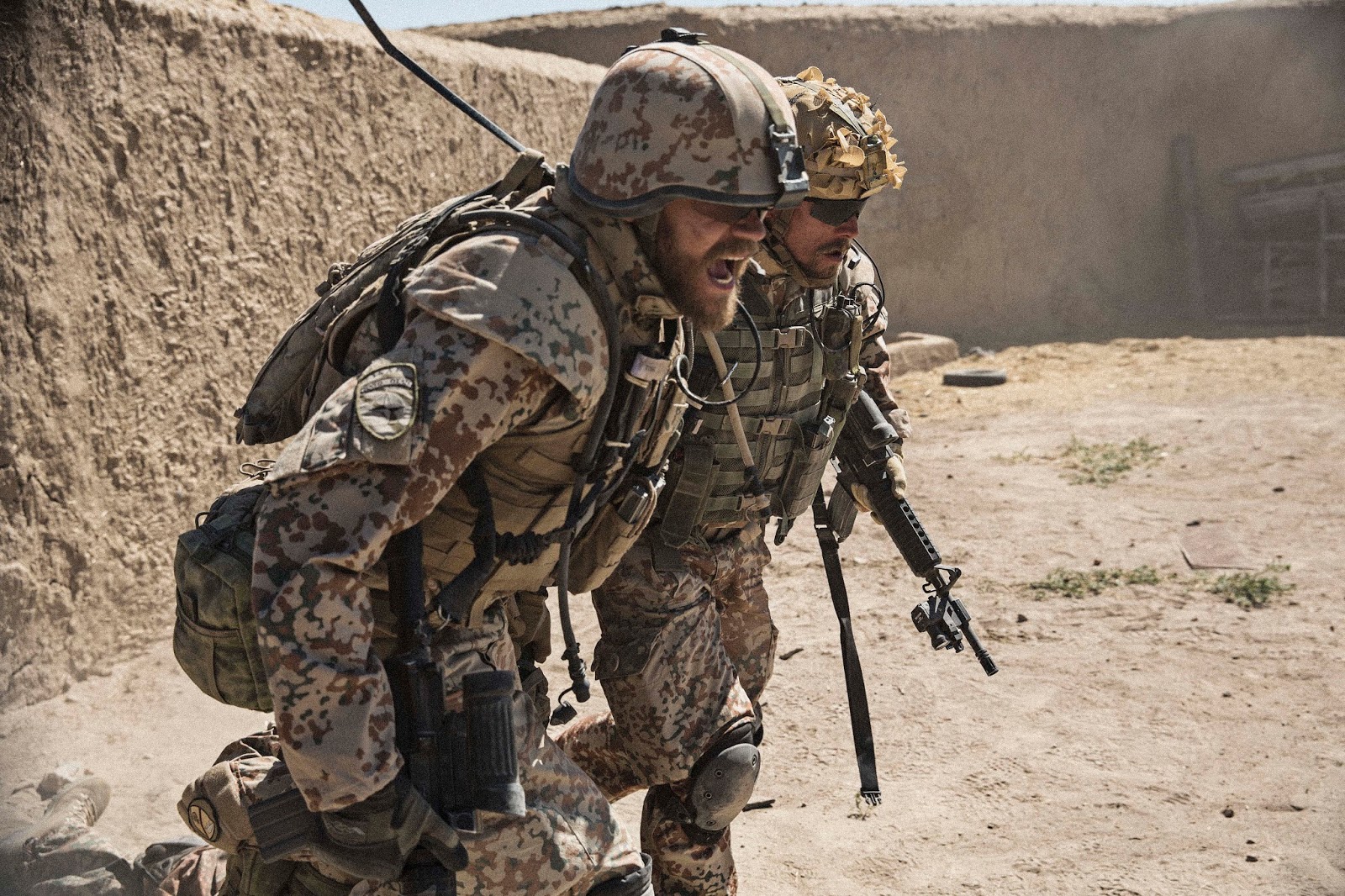 Danish peacekeeping commander Claus Pedersen (Pilou Asbæk, foreground) desperately seeks a way to escape with one of his soldiers (Martin Tamm Andersen, background) while under fire in Afghanistan in the battlefield saga, “A War.” Photo courtesy of Magnolia Pictures.In evaluating the events in a scenario like this, those responsible for rendering judgment are faced with deciding whether the actions in question are acceptable or unacceptable. But, under circumstances like these, is it even possible for there to be meaningful rules of engagement? After all, conflict is conflict, and lives are at stake, regardless of whether they involve civilian or military casualties. In light of that, then, is it indeed realistic to believe that there can be legitimately “acceptable” acts under the conditions of war, that the inherently uncivilized circumstances that prevail during combat can truly be litigated in a civil manner?