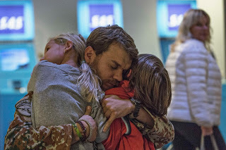 Upon his return from Afghanistan, Danish peacekeeping commander Claus Pedersen (Pilou Asbæk, center) receives hugs from his daughter (Cecilie Elise Sondergaard, left) and son (Adam Chessa, right) in “A War.” Photo courtesy of Magnolia Pictures.