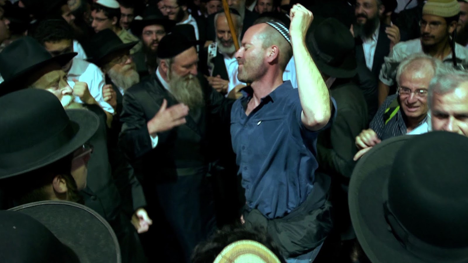 Filmmaker Steven E. Bram (center) dances with orthodox Jewish men while on a pilgrimage to Israel, as depicted in the director’s documentary, “Kabbalah Me.” Photo courtesy of First Run Features.