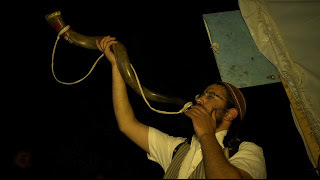 A man blows a ceremonial horn known as a shofar, as seen in the documentary, “Kabbalah Me.” Photo courtesy of First Run Features.