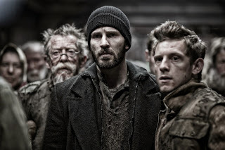 The rigid class segregation of passengers aboard a post-apocalyptic survival train prompts a revolt of the underprivileged against the power elite, led by insurgent leader Curtis (Chris Evans, center) and his compatriots, Edgar (Jamie Bell, right) and Gilliam (John Hurt, left), in the thrilling new action adventure, “Snowpiercer.” Photo courtesy of Radius-TWC.