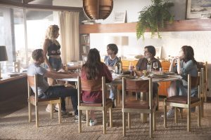 Sunday brunch at the Mohen household turns contentious when family members (from left, Oscar Copp, Lola Marois, Adèle Wismes (back to camera), Ben Attal, Yvan Attal, Charlotte Gainsbourg) debate the future of an unexpected house guest in “My Dog Stupid” (“Mon chien Stupide”). Photo by David Koskas, courtesy of Film Distrib US.