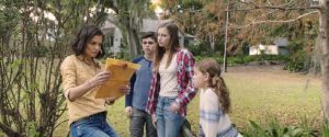 Single mother Miranda Wells (Katie Holmes, left) faces a variety of challenges raising her three children, Greg (Aidan Pierce Brennan, second from left), Missy (Sarah Hoffmeister, second from right) and Bess (Chloe Lee, right), in the new metaphysical love story, “The Secret: Dare to Dream.” Photo by Alfonso Pompo Brescianni, courtesy of Roadside Attractions/Lionsgate.