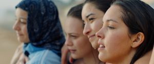 When confronted by fundamentalist insurgents critical of her decadent Western ways, fashion design student Nedjma (Lyna Khoudri, center) stands her ground against those seeking to quash her plans for staging a fashion show in “Papicha.” Photo courtesy of Distrib Films US.