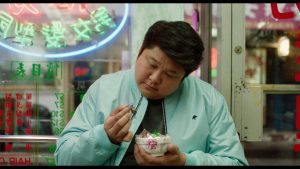 A somewhat-daft gentle giant who knows how to throw his muscle around, bodyguard Big Pong (Corey Ha) shields a crafty grandmother from criminal elements in “Lucky Grandma,” now available for first-run online streaming. Photo courtesy of Eduardo Mayén, Good Deed Entertainment and Kino Lorber.
