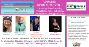 Join host Frankie Picasso, author Sandra Beck and yours truly for a special edition of The Good Media Network’s Mission Unstoppable when we speak with filmmaker Renee Scheltema about the new, updated version of her sustainability documentary, “Normal Is Over 1.1.” Tune in to Facebook Live on Thursday April 30 at 1 pm ET by clicking here. For more information, click here.