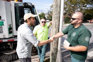 Sanitation workers (center and right) are among the many diverse people urban hiker Matt Green (left) has encountered during his journey to walk all 8,000+ miles of New York’s streets, paths and bridges as seen in the documentary “The World Before Your Feet.” Photo courtesy of Greenwich Entertainment.