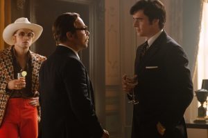 Self-serving manager/promoter John Reid (Richard Madden, right) frequently ran afoul of music industry professionals like Dick James (Stephen Graham, center) and even his own client and life partner, Elton John (Taron Egerton, left), as seen in “Rocketman.” Photo courtesy of Paramount Pictures.