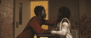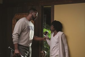 The unexpected arrival of mysterious visitors causes stress for middle-aged housewife Adelaide Wilson (Lupita Nyong’o, right) and her husband, Gabe (Winston Duke, left), in “Us.” Photo by Claudette Barius, courtesy of Universal Pictures.