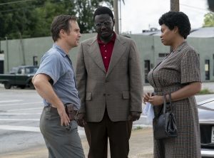 Community activist Ann Atwater (Taraji P. Henson, right) and Ku Klux Klan leader C.P. Ellis (Sam Rockwell, left) are brought together by facilitator Bill Riddick (Babou Ceesay, center) to resolve common issues in the new fact-based historical drama, “The Best of Enemies.” Photo by Annette Brown, courtesy of STXfilms.
