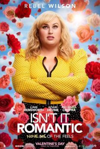 “Isn’t It Romantic” (2019). Cast: Rebel Wilson, Liam Hemsworth, Adam Devine, Priyanka Chopra, Brandon Scott Jones, Betty Gilpin, Jennifer Saunders, Alexandra Kis, Ray Anthony Lewis, Zach Cherry, Sandy Honig, Dean Neistat. Director: Todd Strauss-Schulson. Screenplay: Erin Cardillo, Dana Fox and Katie Silberman. Story: Erin Cardillo. Web site. Trailer.