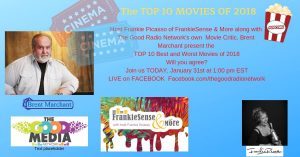 Join host Frankie Picasso and me for the next edition of Movies with Meaning on The Good Media Network’s Frankiesense & More broadcast on Thursday, January 31, at 1 pm ET. In this special edition, we’ll talk about the Top 10 Movies of 2018. For the video version, tune in on Facebook Live by clicking here. And, for the audio only podcast edition, check out The Good Media Network’s home page by clicking here. Join us for a fun look back at the year’s best!