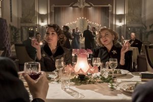 With their wives Lucille (Shirley Henderson, left) and Ida (Nina Arianda, right), respectively, the comedy duo of Oliver Hardy and Stan Laurel enjoy the good life while on a stage show tour of England and Ireland in “Stan & Ollie.” Photo by Nick Wall, courtesy of Sony Pictures Classics.