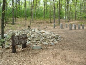 Thoreau’s Walden Pond cabin site and memorial rock cairn. Photo courtesy of Films by Huey.
