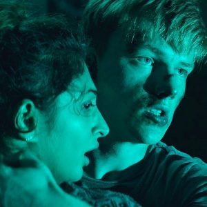 Nick Milgram (Sam Gittins, right) and his girlfriend, Annji (Neerja Naik, left), hold on for dear life in director Johnny Kevorkian’s excellent new smart horror film, “Await Further Instructions.” Photo courtesy of Goldfinch Studios and Shudder Films.