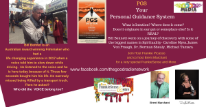 A Voice told Bill Bennett to slow down. “Slow Down?” he thought. “I want to speed up to catch the green light.” Bill was on his way to the airport. The Voice told him again “SLOW DOWN!” So he did. Those precious seconds bought Bill his life. A transport truck barreled through the intersection, and Bill was within a hair’s breadth away from sure death. It made him wonder. “Who or what was that Voice? Where did it come from?” Join Frankie Picasso and yours truly on a special edition of The Good Media Network’s Frankiesense & More as we interview Bill about his life-altering journey, as detailed in his new documentary, “PGS: Intuition is Your Personal Guidance System.” Tune in by clicking here for a fascinating discussion.