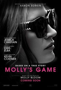 “Molly’s Game” (2017). Cast: Jessica Chastain, Idris Elba, Kevin Costner, Michael Cera, Jeremy Strong, Chris O’Dowd, J.C. MacKenzie, Brian d’Arcy James, Bill Camp, Graham Greene, Claire Rankin, Samantha Isler, Piper Howell. Director: Aaron Sorkin. Screenplay: Aaron Sorkin. Book: Molly Bloom, Molly’s Game: From Hollywood’s Elite to Wall Street’s Billionaire Boys Club, My High-Stakes Adventure in the World of Underground Poker. Web site. Trailer.