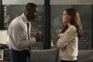 Onetime Olympic hopeful-turned-poker game operator Molly Bloom (Jessica Chastain, right) consults her high-powered lawyer, Charlie Jaffey (Idris Elba, left), when she finds herself in hot water in writer-director Aaron Sorkin’s latest offering, “Molly’s Game.” Photo by Michael Gibson, Motion Picture Artwork, courtesy © STX Financing, LLC.
