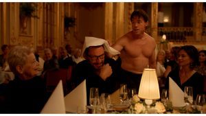 Performance artist Oleg (Terry Notary, standing) gets carried away with his antics at a banquet for museum patrons in the unusual new Swedish satire, “The Square.” Photo courtesy of Magnolia Pictures.