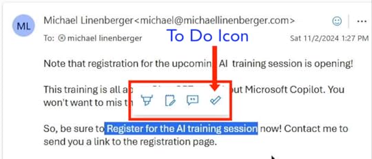In a new video I just posted to that course, video G-8, I show a trick that enables you to pre-fill the new task title with text other than the title of the original email. Rather, you pick the text from the body of the email, which can yield exactly the right title! And you don’t have to drag and drop the email, rather just click the To Do icon that appears above the selected text, and that creates the new task with that text prefilled in the title.