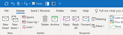 Most of you, if you get the update (I had to manually update my Outlook through my subscription to get this), will see only cosmetic changes. All the ribbon icons have been updated in what I think is a pleasing way. Here’s a glimpse of how it now looks on the left side of the Home tab: