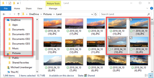 Then, when I want to share some pictures that are on my computer and mirrored to OneDrive I do this: with the Pictures folder open and displayed in File Explorer on my computer (see below, in Windows 10), I simply select one or more images on the right using the checkboxes.