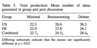 More importantly, he's asking the wrong question. There is no singular best template for group creativity. When I'm hired to advise teams, the first thing I do is study the culture of the team. My advice will be based on who they are and what will work for them, not on an abstract set of principles. Just as there isn't a best template for group morale, or teamwork, or group anything. Is there a singular best template for good writing? For being a good person? A singular template denies how divergent individuals, teams and cultures are. Nemeth's data shows a wide disparity between French and American success at brainstorming: clearly culture does matter.