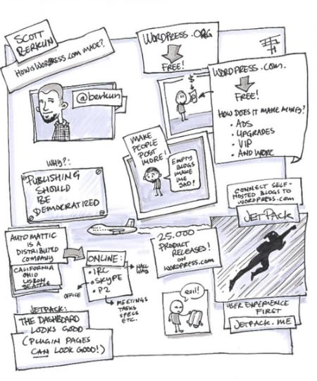 I gave a short lecture on how wp.com is made at WordCamp Seattle (an informal series of events around the world for people interested in WordPress) which you can watch below. When I gave this talk again in Portugal, someone from Corefactor made a sketchnote, documenting the core points I made.
