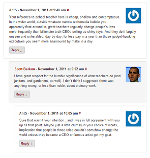 It only took a zillion years, but scottberkun.com finally has fully threaded comments. Now you can disagree with someone, and have them disagree right back, with visual formatting that fully clarifies they are disagreeing with just you and your post, and not anyone else.