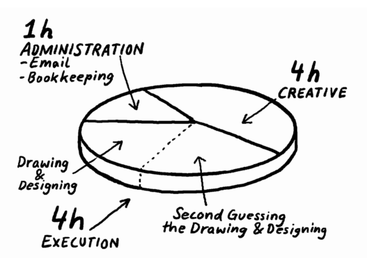 Great little diagram from an excellent talk by Christoph Niemann. He's showing an honest accounting of how his day as a designer/illustrator gets divided – note the time spent second guessing himself.