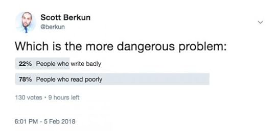 In this case I predicted it would be nearly even. I thought the poll was clever, but not particularly interesting as binary choices often create false dichotomies. I admit I was quite surprised to see the result (21% write badly, 79% read poorly):