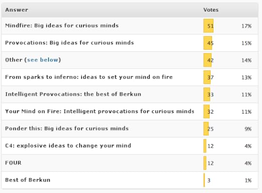 As you can see 14% of you chose to take things into your own hands, and offered a write-in vote for the title. Since you took the time, I did read them all and they're listed here: