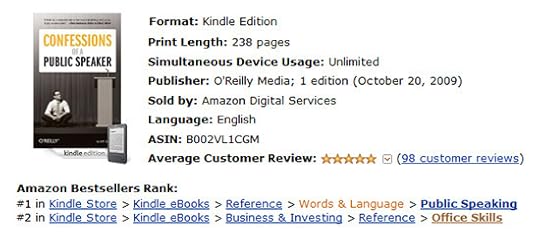 Confessions of a Public Speaker is currently the top book on Public Speaking on Kindle. With 98 reviews and a near 5 star average, it's a nice surprise to see it still doing well. Thanks to everyone who's bought a copy.