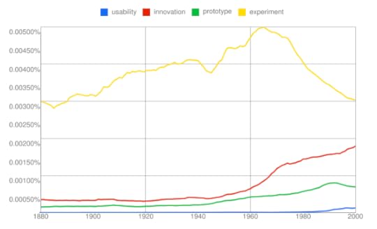 Playing around with the new Google Labs Ngram viewer (which searches for usage of words in the entire google books archive), I compared the use of four words, usability, innovation, prototype, and experiment, over the last 100 years. Chart shown below: