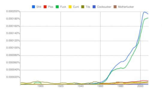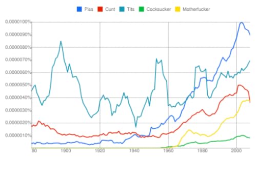 Ok, this is pure fun. I took George Carlin's 7 Dirty words (The only words you can't say on U.S. television, or couldn't), and put them into Google Labs Ngram viewer (which searches for usage of words in the entire google books archive). I made a guess before I ran the query – I expected all the words to rise in usage over the last 40 years. I was wrong: