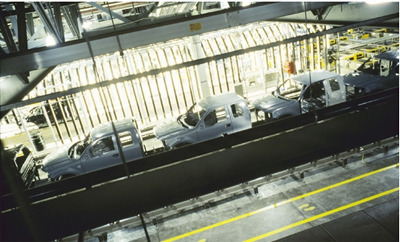 Workers stand on moving skids, traveling with each car until their tasks are done. Then they step off, and move back up to the next car. The line moved perhaps a foot or two every second. Not that fast to my nieve eyes, but given the number of tasks each worker had to perform, it was impressive none the less. And the longer I watched the more impressive this pace seemed.