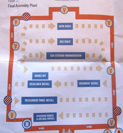 Most fascinating was the design of the line itself. Hundreds of details must be sorted for each car, and communicated to dozens of workers. Huge scoreboards showed the line status, but other terminals and indicators helped each section discover and track what needed to be done for each car. Designing a system like this involves a huge set of skills: interaction design, workflow, process, economics… the amount of thinking that goes into a line like this is hard to fathom. And the work involved by each person on the line, despite the automation and technology, was intricate, careful and precise. In just a few minutes of watching anyone on the line, I was reminded of how much effort goes in to make a single car, much less 1000 or so a day. It really did make me want to go buy a Ford F-150.