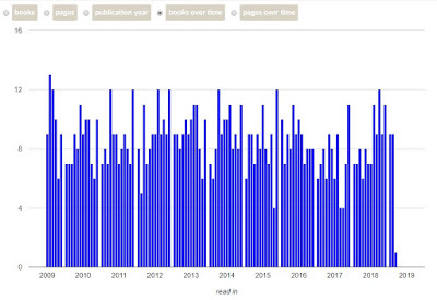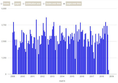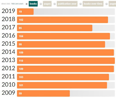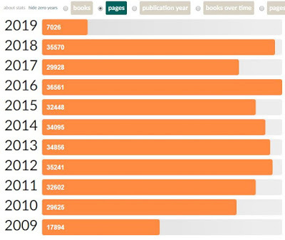 This morning's review was the 1000th on the blog. I've just spend a little while looking at the stats - which given the day job I'm inclined to do. It's taken 502 weeks to reach 1,000 books (all reviews available here), which is pretty much spot-on averaging two books a week (1.99). The books total some 325,846 pages according to Goodreads (though a couple are missing page counts in their database), or just shy of 93 pages per day. Both of those seem about right, with some fluctuation across weeks and days.Of the books, 883 were fiction and 117 non-fiction. 128 were by Irish authors. 166 were historical fiction set between 1930-1960. I bought nearly all of them, with a handful being review copies and a dozen or so gifts - I'm happy to make sure authors get some royalties and I don't want to feel obliged with respect to what I'm reading. I'll give a breakdown of location later in the week, but via the fiction I visited 75 countries, and a few more via non-fiction.