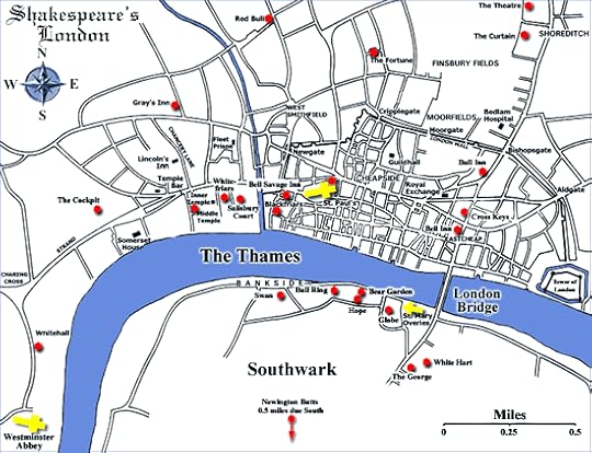Here’s a rough map of what was considered London (i.e. the important bit that was then surrounded by farms and suburbs n’ crap) in Shakespeare’s day: