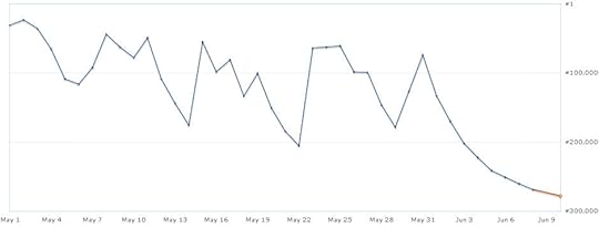 Second thought – I can map the spikes and jumps to specific times I’ve promoted or talked about the book. For instance, the big jump on May 23 is when I was on Byte Into It to talk about the concept and the book. That gigantic jump – from #200 000 to #63 000 – is only four sales, but that’s just Amazon weirdness. So what I should do is confirm what gets the attention for those spikes and keep doing it, and I’ll talk about that below.
