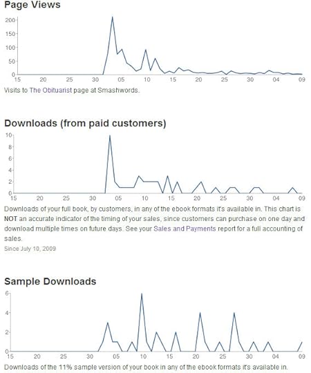 [image error]Anyway, it’s been close to six weeks since The Obituarist came out, and I’ve tried to abide by my promise not to talk incessantly about it here and become a boring spammy snake-oil merchant. But I also promised, back when I started this blog, to be as open as possible about the process of not just writing but creating, promoting and selling my ebooks, in the hope that any data I can share might help someone else with their own efforts.