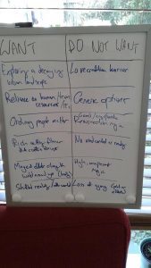 So I got a group together, pitched a basic concept (urban fantasy, Fate system) and we went around coming up with ideas about what we did and didn’t want to see in the game, as per the whiteboard below. After some more back and forth, we had a rough sketch of a game about a family of dodgy artefact merchants, scavenging for mystic items and doing deals with otherworldly forces, along with some initial plot hooks and NPC names.
