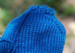 The right toe's better than the left. You can at least see on the right one that the stitches should flow right across the toe end. But I started on the left one and was interrupted repeatedly, each time losing my concentration for long enough to make a mistake. Undoing the mistakes and trying to redo them was not only frustrating, but made the yarn fray and fuzz (it didn't help that two of the interruption-errors involved splitting the yarn with the strand I was using for grafting.