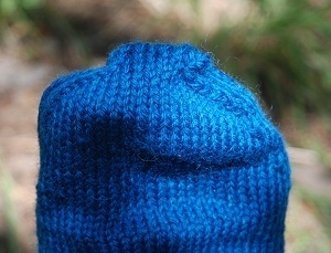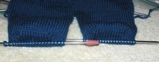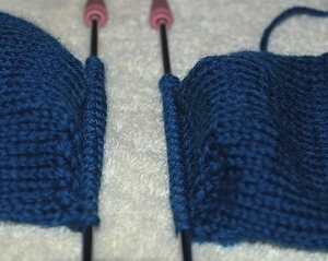 Here the heels are "nose to nose" or "heel to heel," forming an arch and with the central stitches pointing "down" (what will be forward, on the bottom of the foot, when the sock is on. Unlike the heels of the first (red) pair, these heels look alike and are smoother.