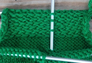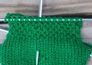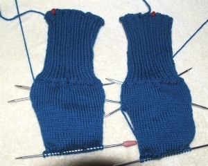 And Green One socks, the pair after Blue One, both now have ribbing long enough that it won't easily invert itself through the space between needles.