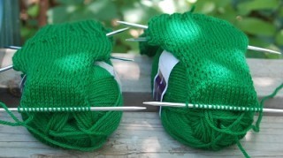 Since I didn't do the sensible thing and do a pattern swatch before starting it, I know it's affecting my gauge but not how much. (Yes, sometimes it really is smart to do that swatch ahead of time. Sigh. Well, I have two more balls of green yarn to play with, if these socks turn out to be a very difficult fit...)
